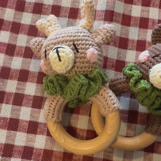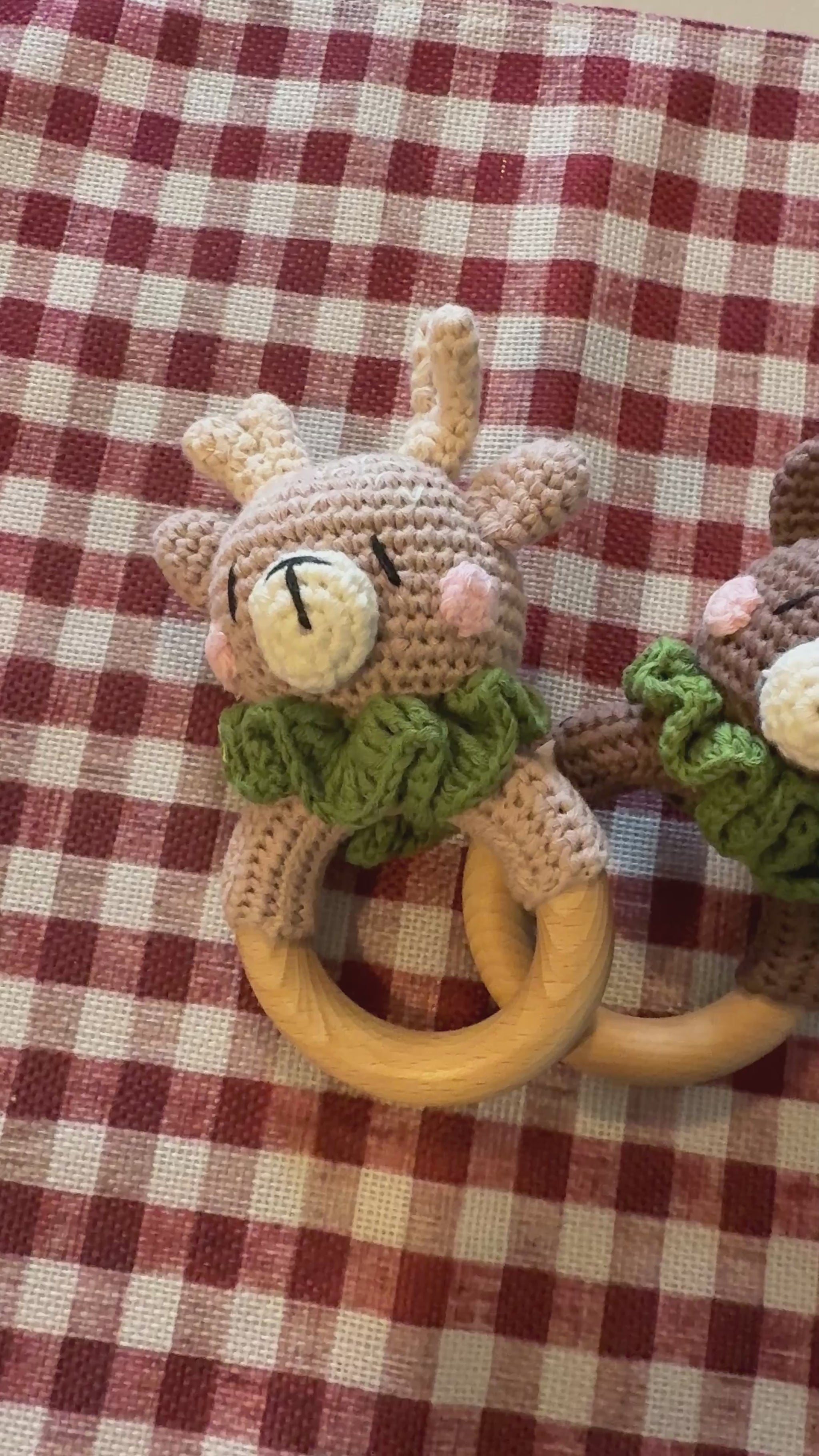 Gehäkelte Hasenrassel auf einem hölzernen Beißring. Der Holzring hat einen Durchmesser von 2,75 Zoll.