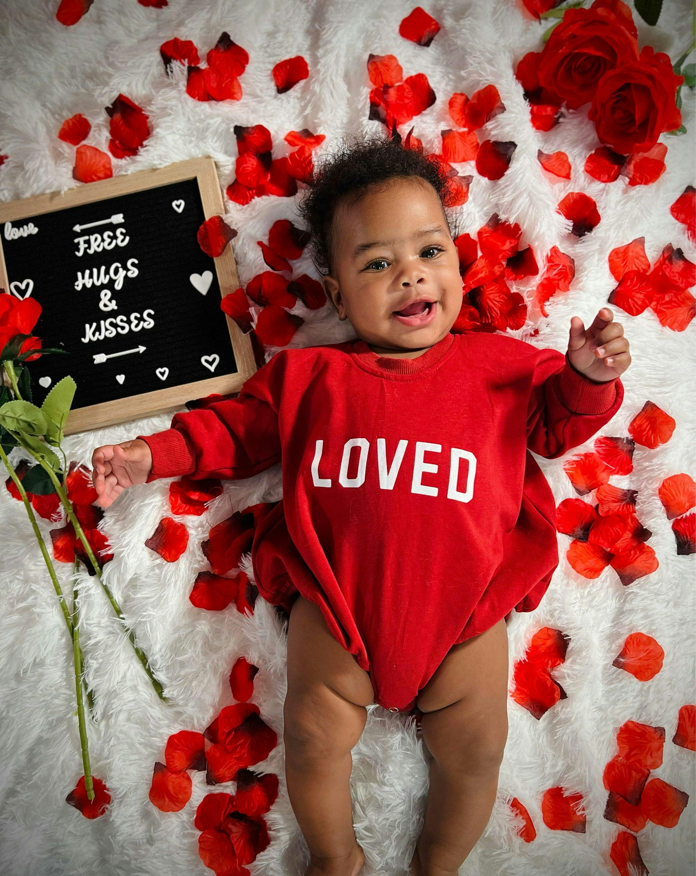 Beliebter, übergroßer Sweatshirt-Strampler mit Grafik und Druckknöpfen im Schritt. Leichtes Baumwollfrottee-Material mit dem perfekten Maß an Festlichkeit für Ihre Valentinstagsfeierlichkeiten.