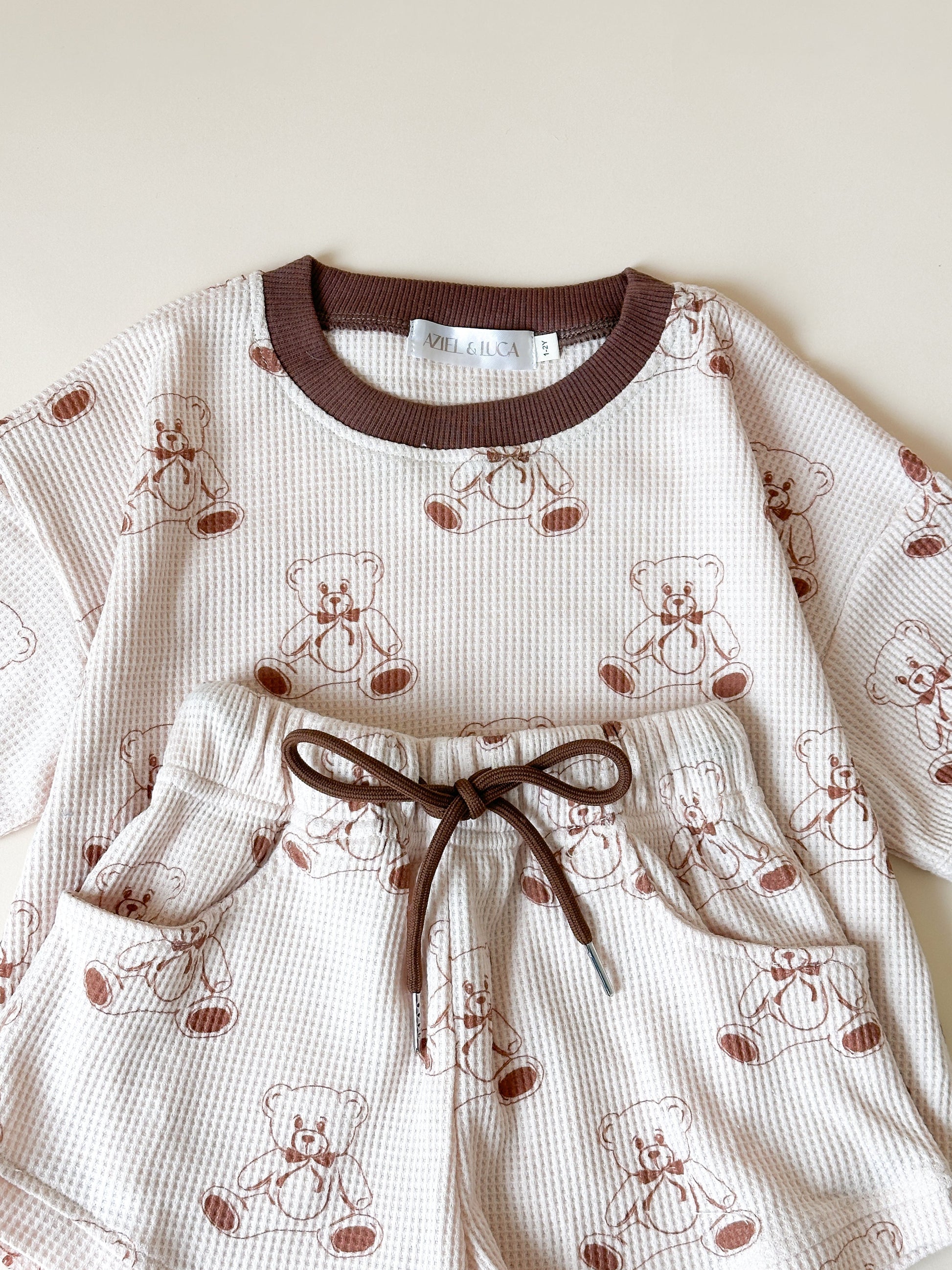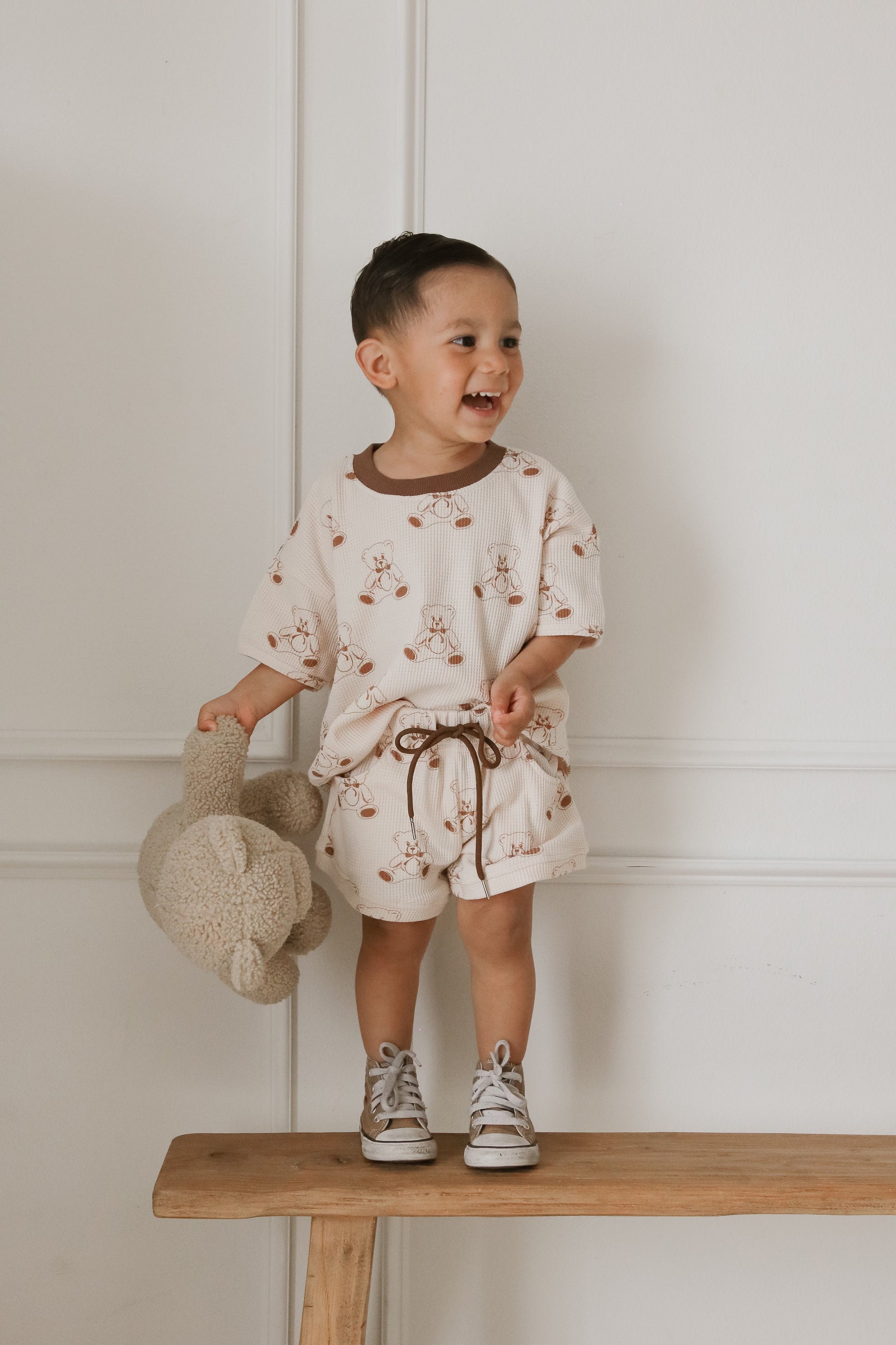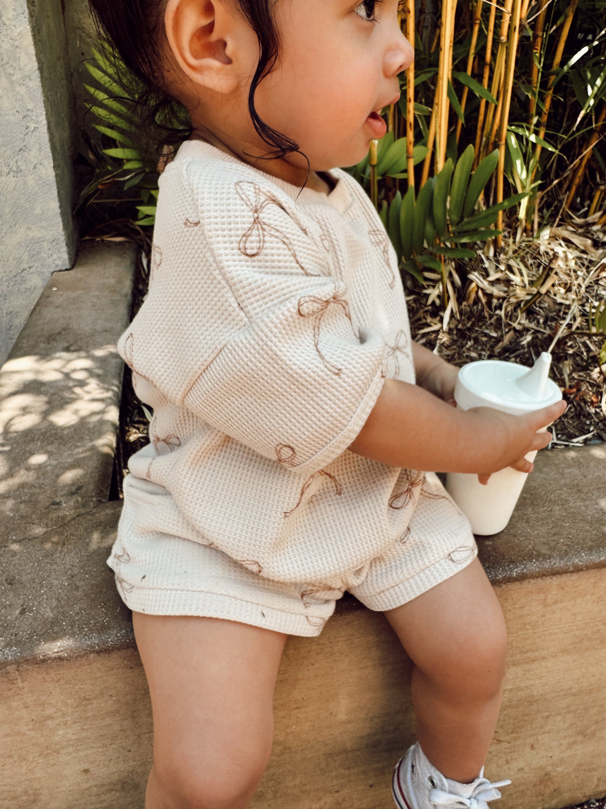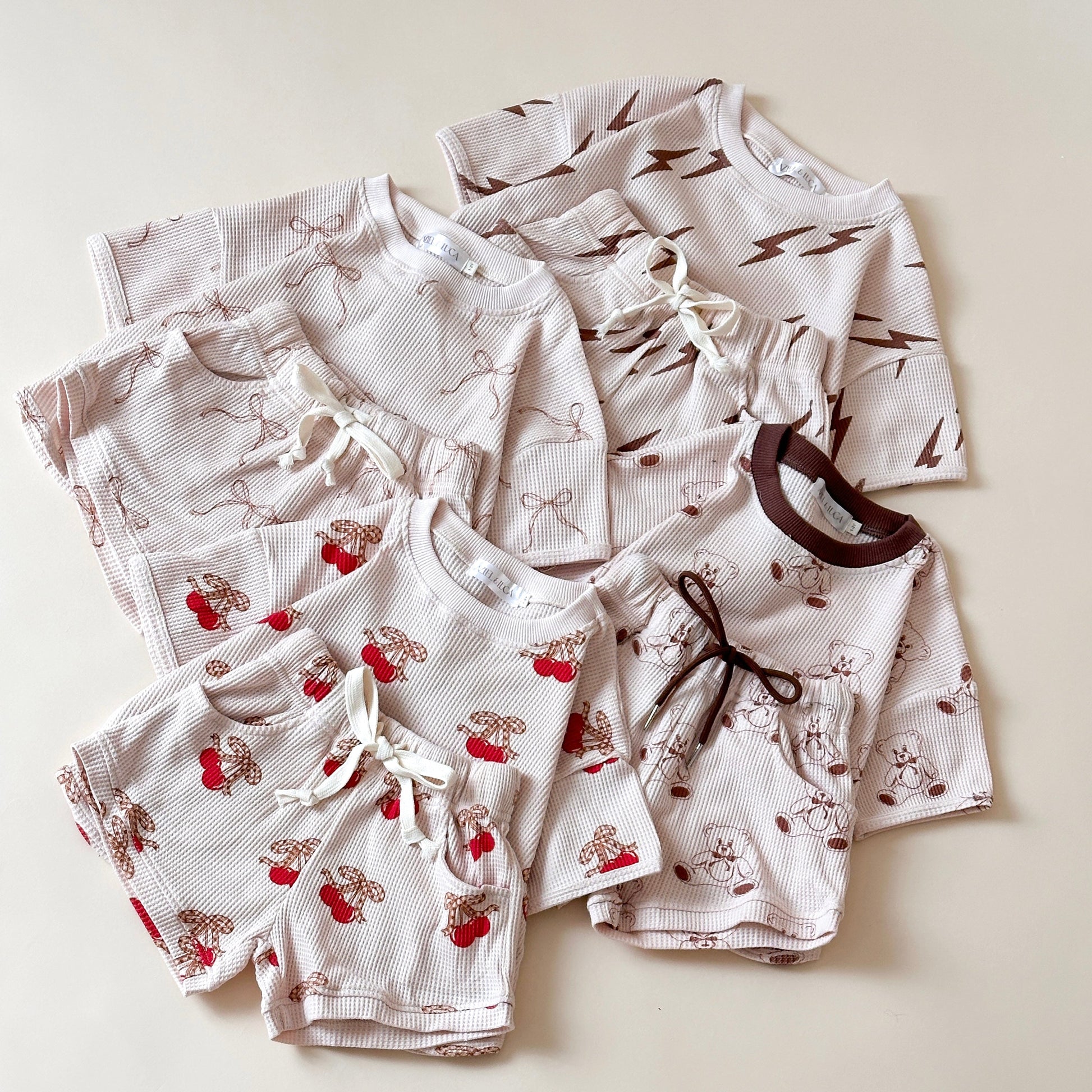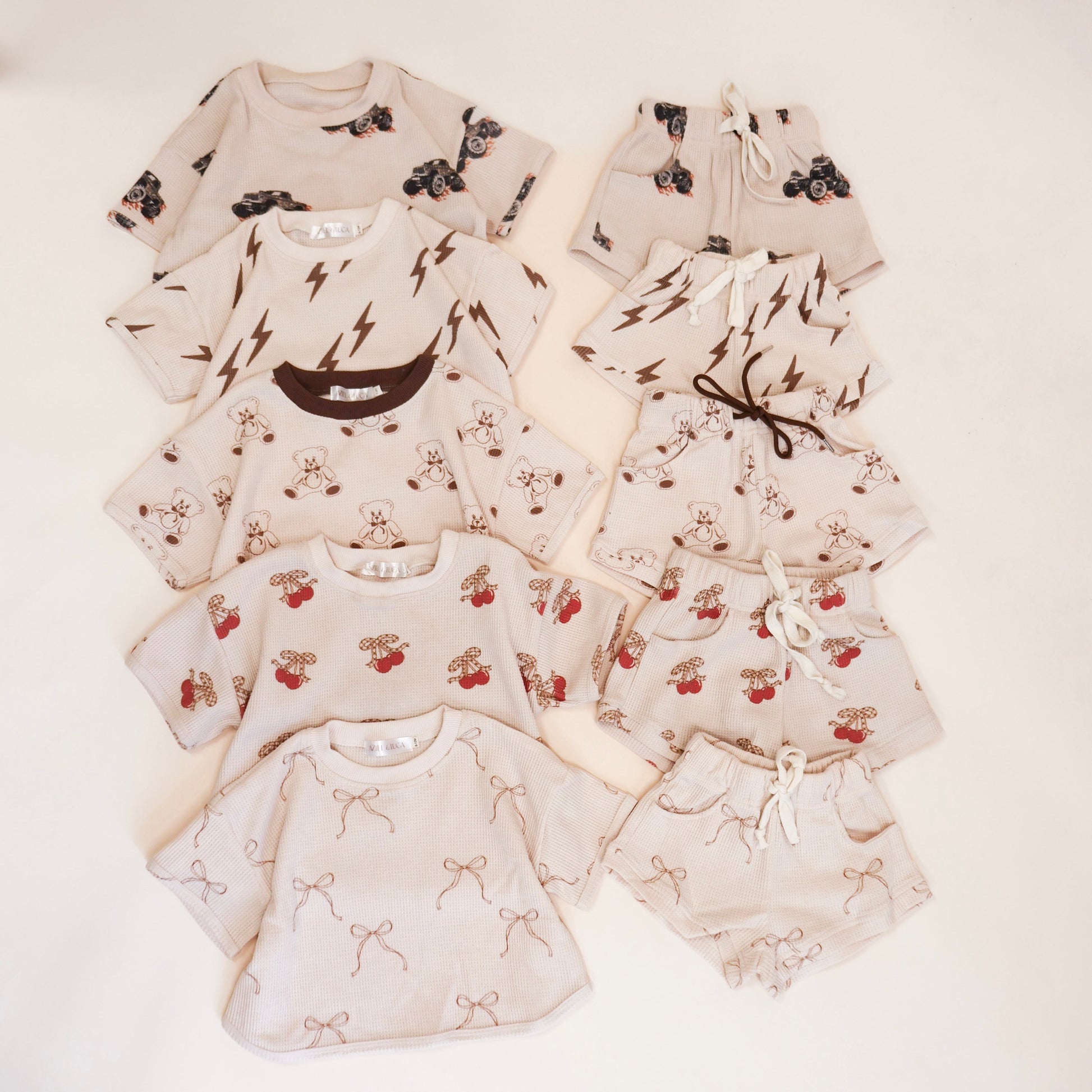 Get ready to add a dash of fun and whimsy to your little one's wardrobe with our adorable Bolt, Bow, Cherry and Bear Print Baby Waffle Sets! Made from our signature soft and cozy waffle material, these sets are perfect for the warm summer months ahead.