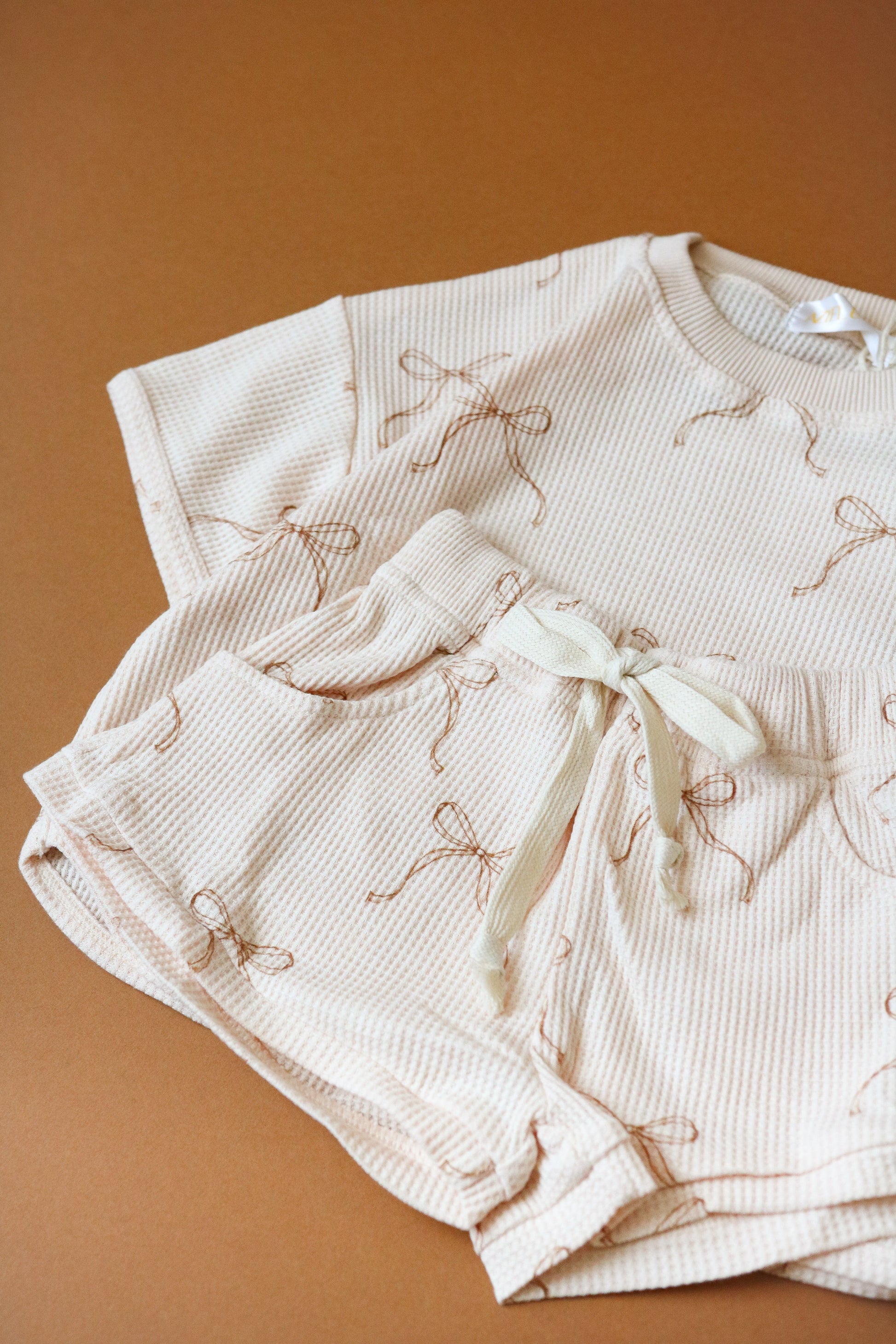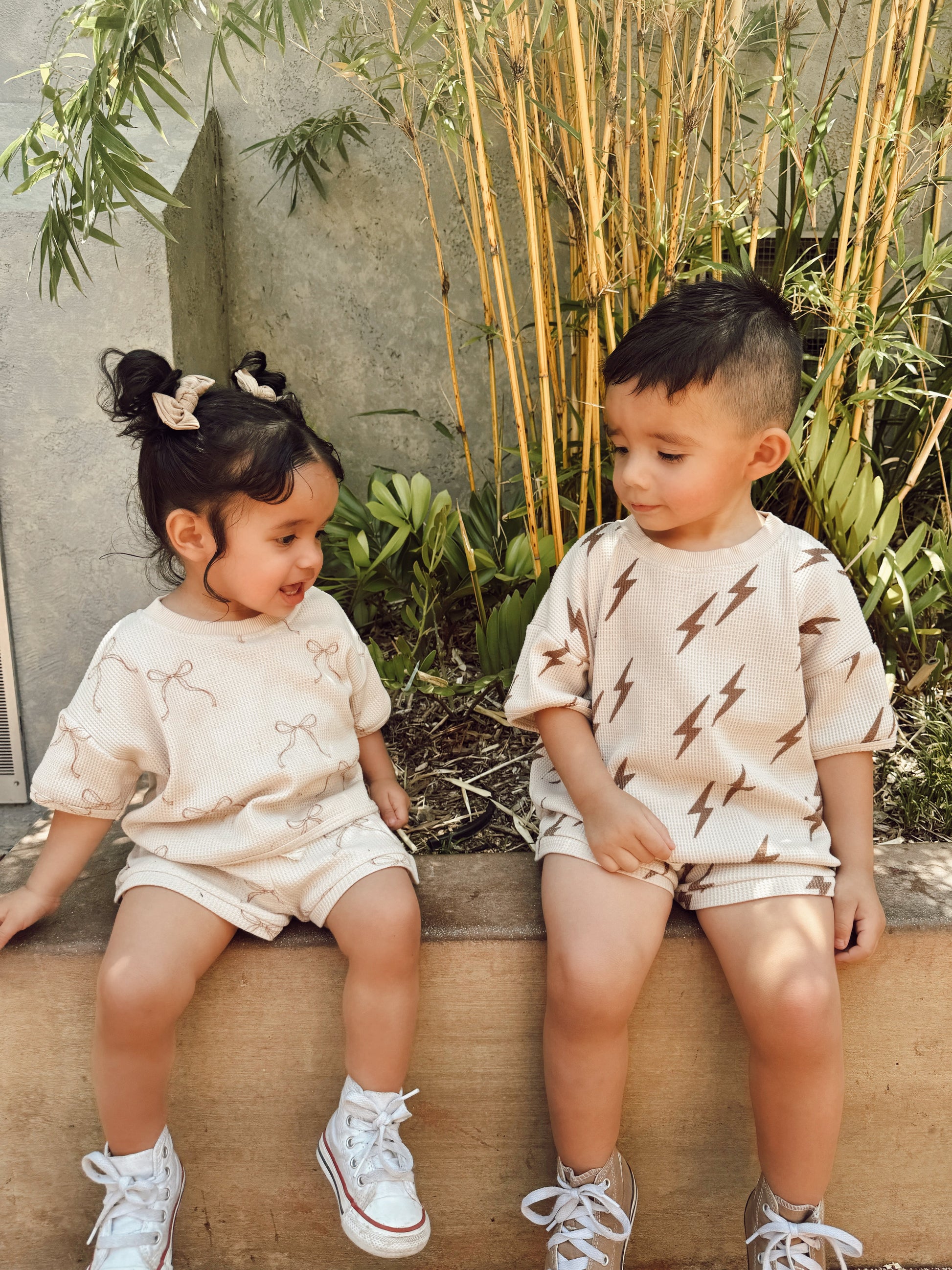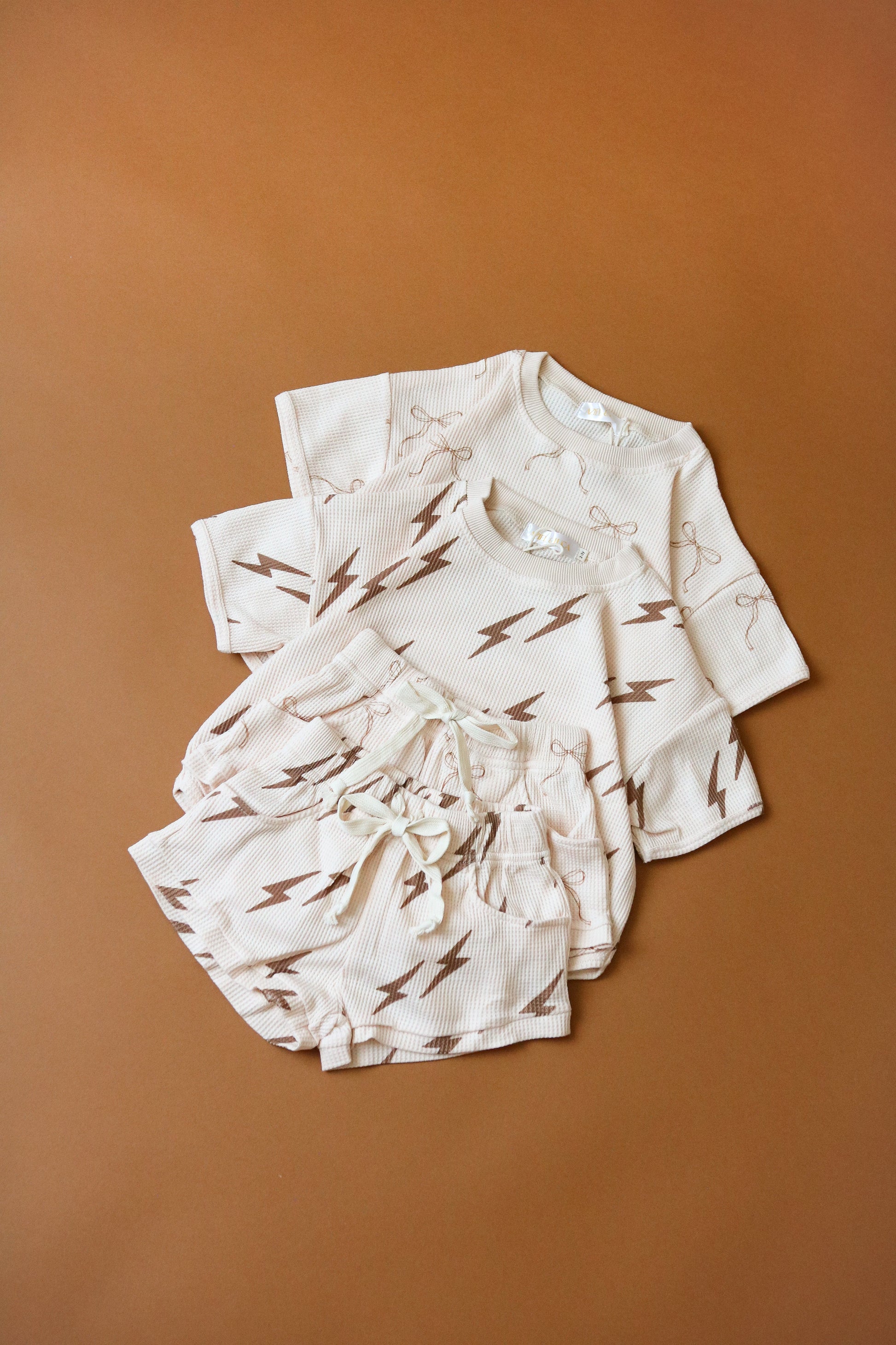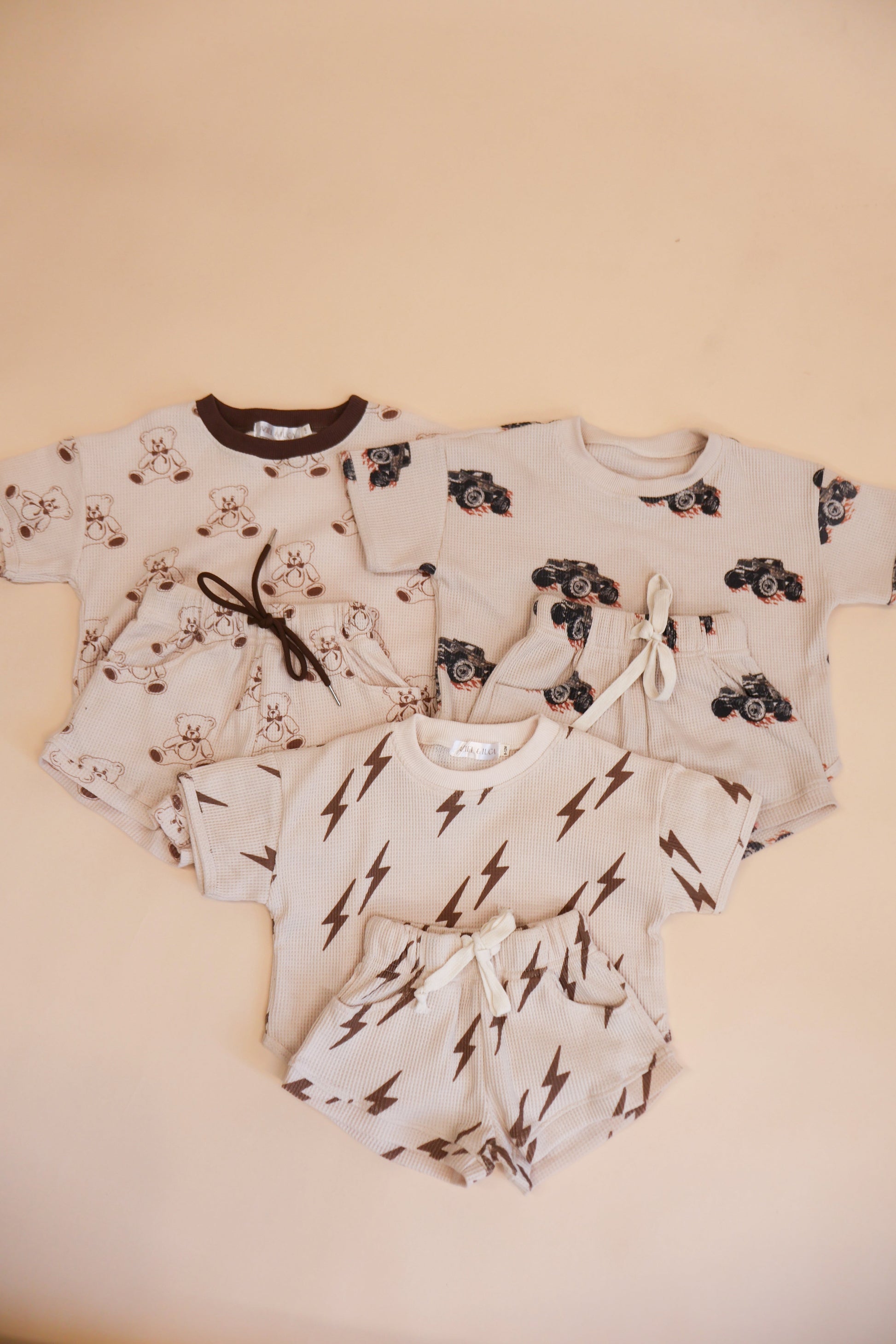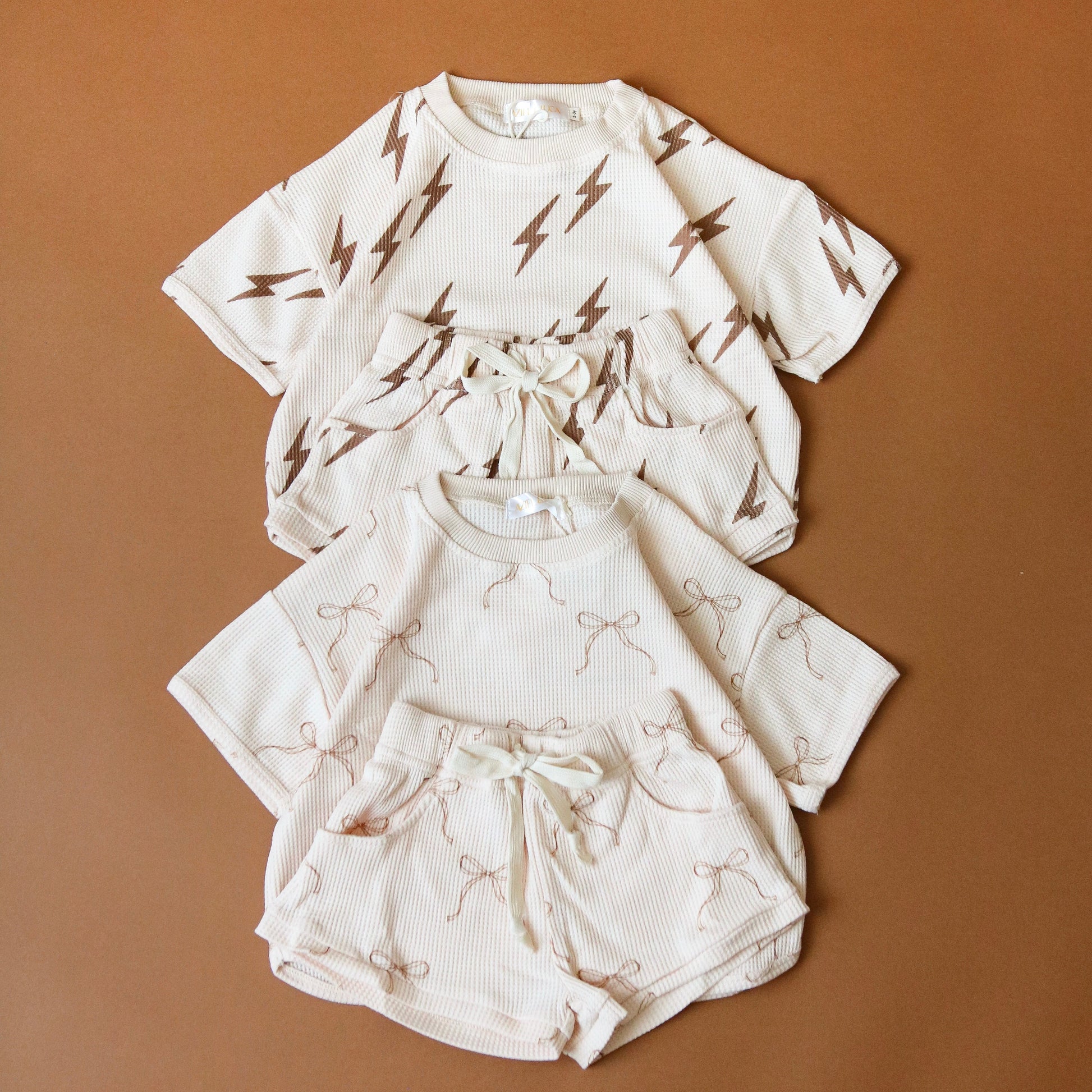 Our waffle Set features a neutral design that's sure to make them stand out in a crowd. The bolts and bows print make it the perfect choice for a summer of adventure and exploration.
