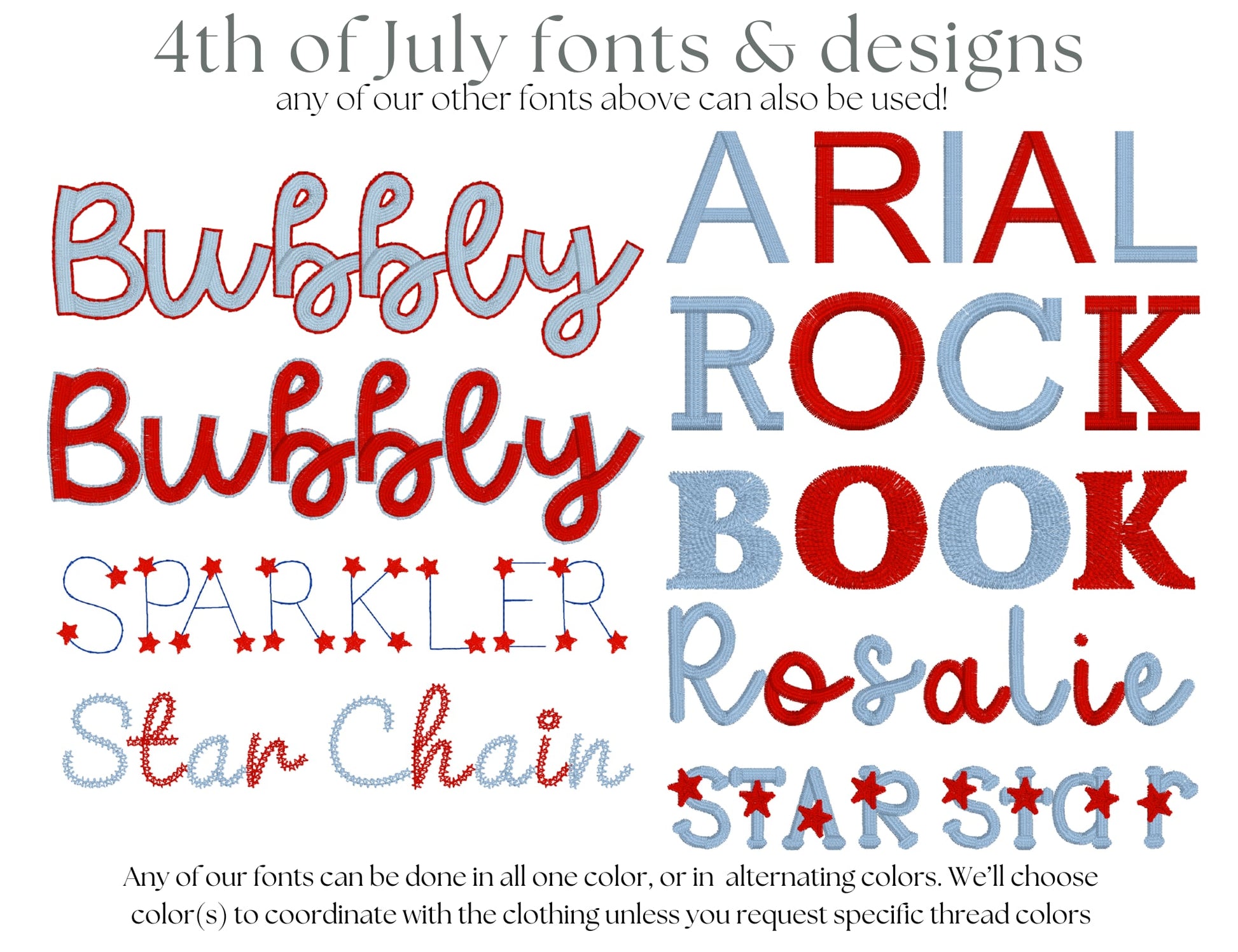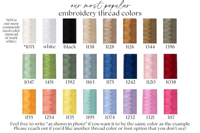 - Check the photos for font and thread color options—don’t see what you need? Email us at help@shoplittlejoy.co.