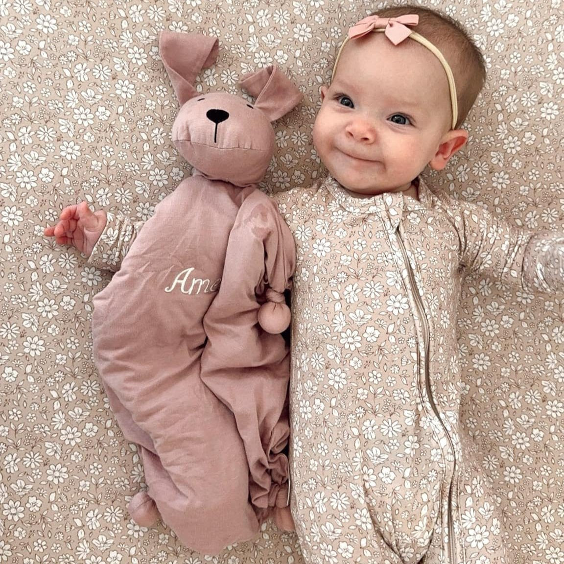 I got two mustard puppies with my son’s name embroidered on them. Two so when one is washing he can still have one, and in case one were to get lost or damaged he’d still have one. He is 5 months so not super attached to anything yet, but my hope is that he comes to love it and that it brings him comfort. These loveys are so perfect for snuggling and holding. The material is amazing, and I liked that the flat part is more thick and plush than others i have seen. I couldn’t have found a better lovey for him.