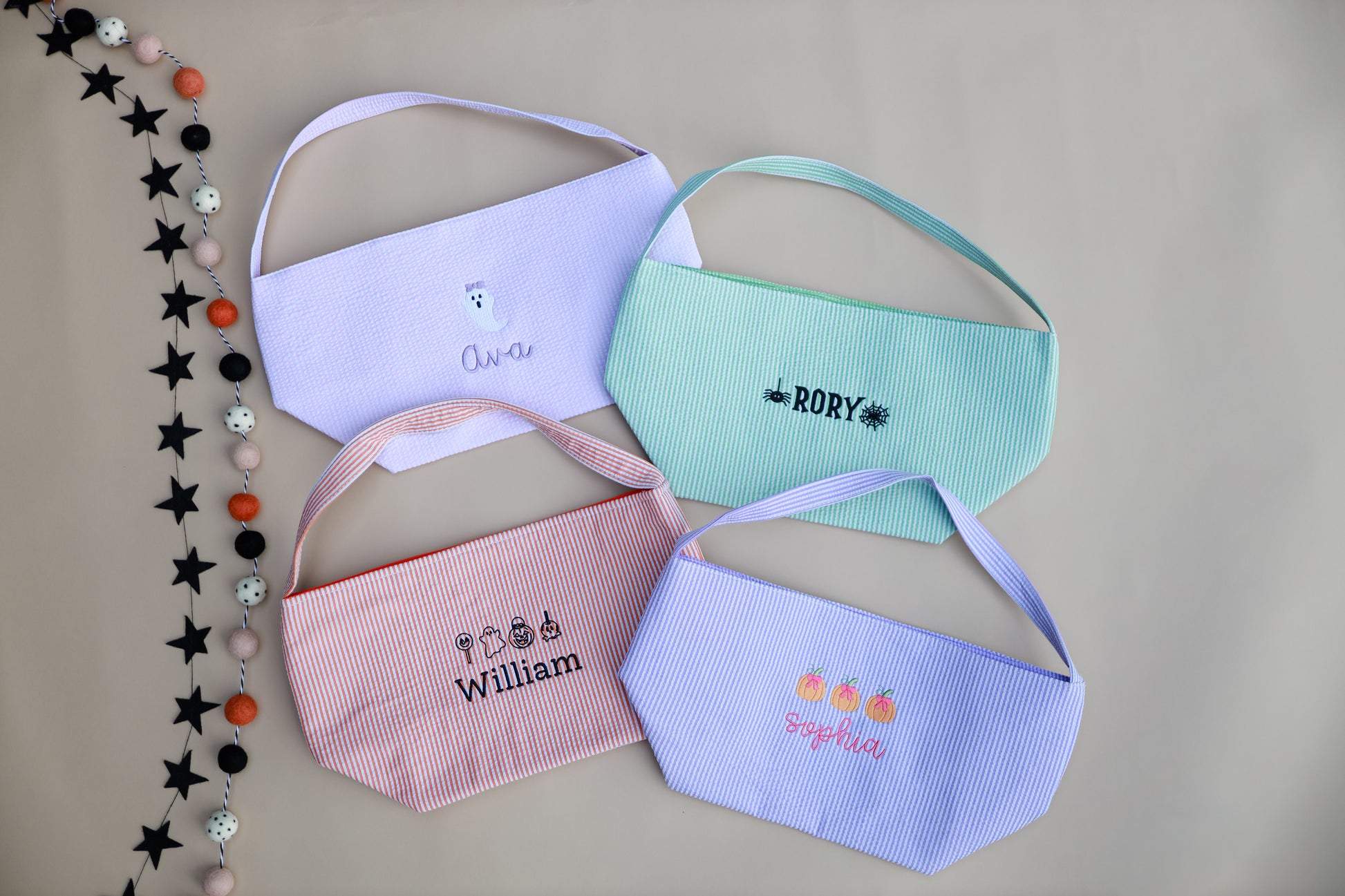 Any of the shown designs can be done on any color basket, colors and fonts can also be customized! Or if you see another design on any of our Halloween clothing that you'd prefer, we can also do any of those. Possibilities are endless!