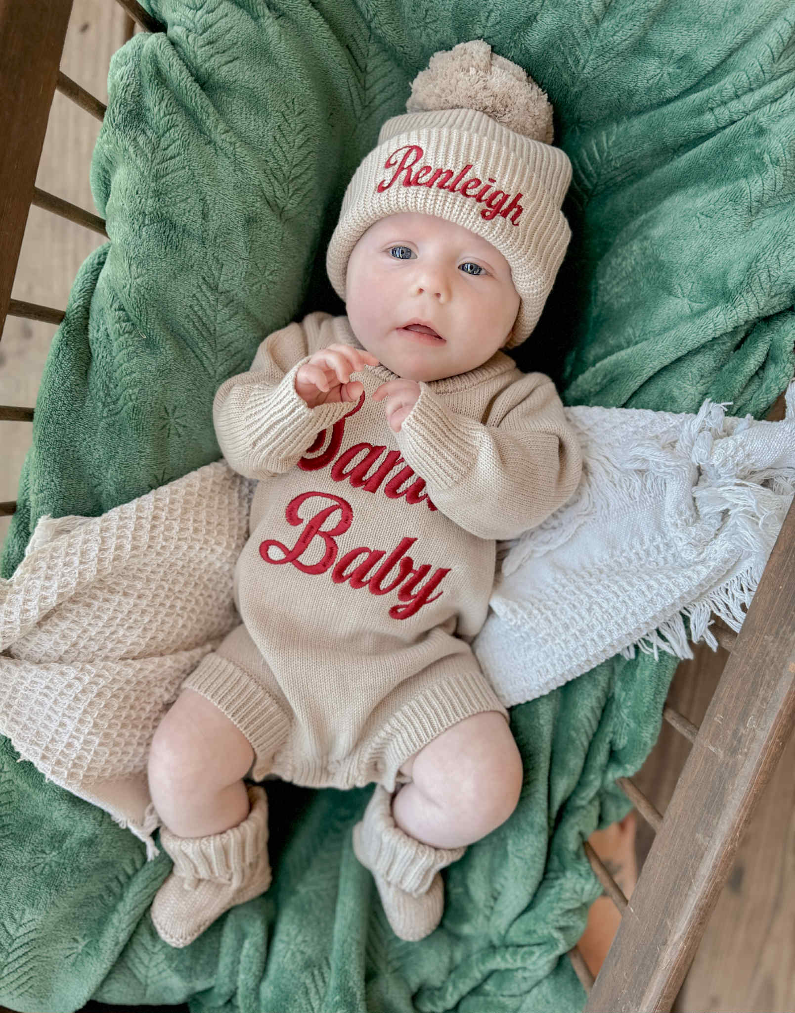 Custom Embroidered Santa Baby Christmas Knit Sweater Romper + Add-On Booties & Hat Set