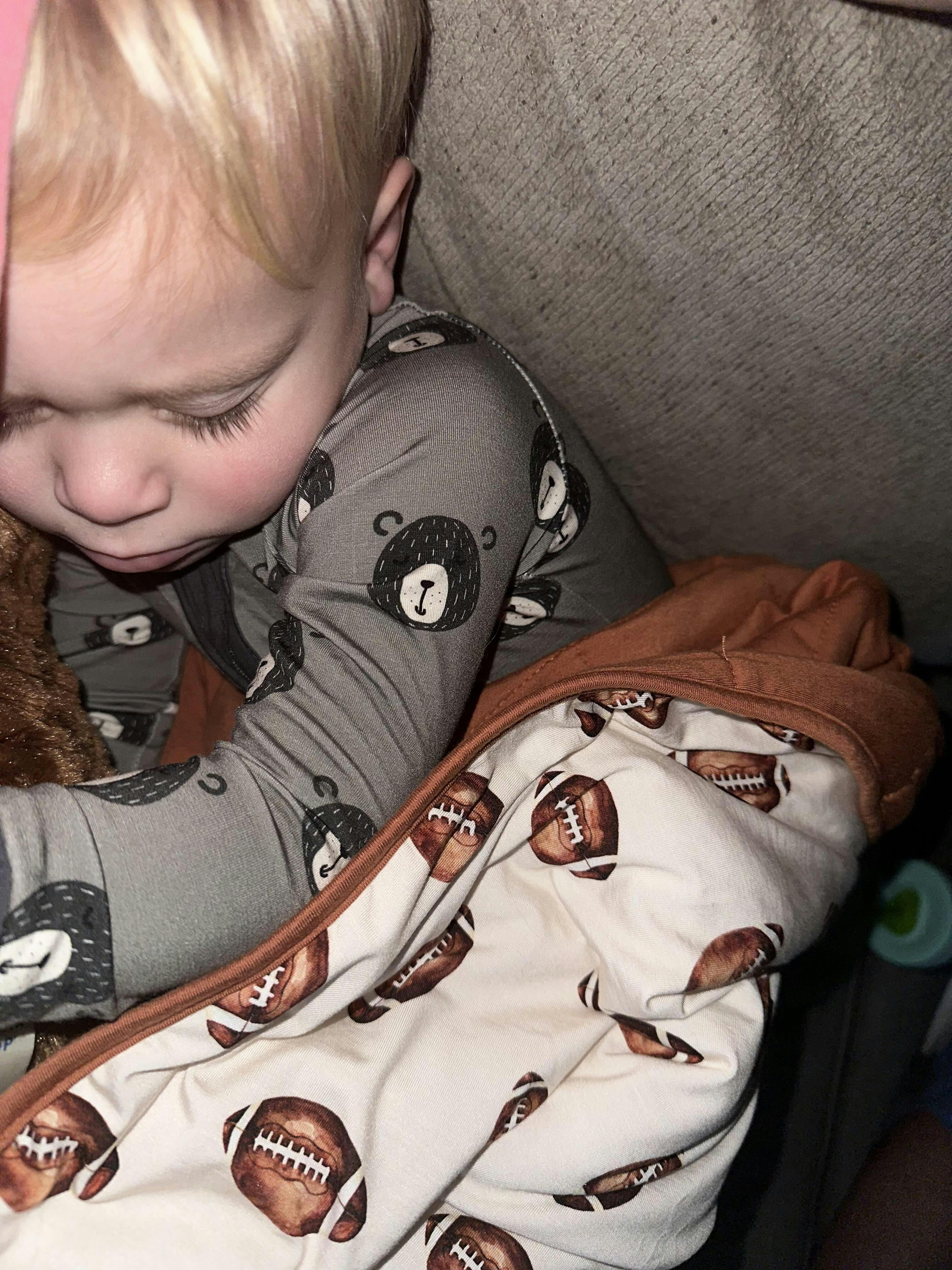 Introducing our Football Print Quilted Bamboo Blanket, designed for your toddler's ultimate comfort and style. Made from 95% Bamboo Rayon and 5% Spandex on the outside and lined with 100% Polyester, this blanket is silky-soft, hypoallergenic, and just the right warmth for sleep or cuddles. With a playful football print and a generous size of 57 inches by 40 inches (toddler size), it's the perfect blend of luxury and functionality for your little one's cozy moments.