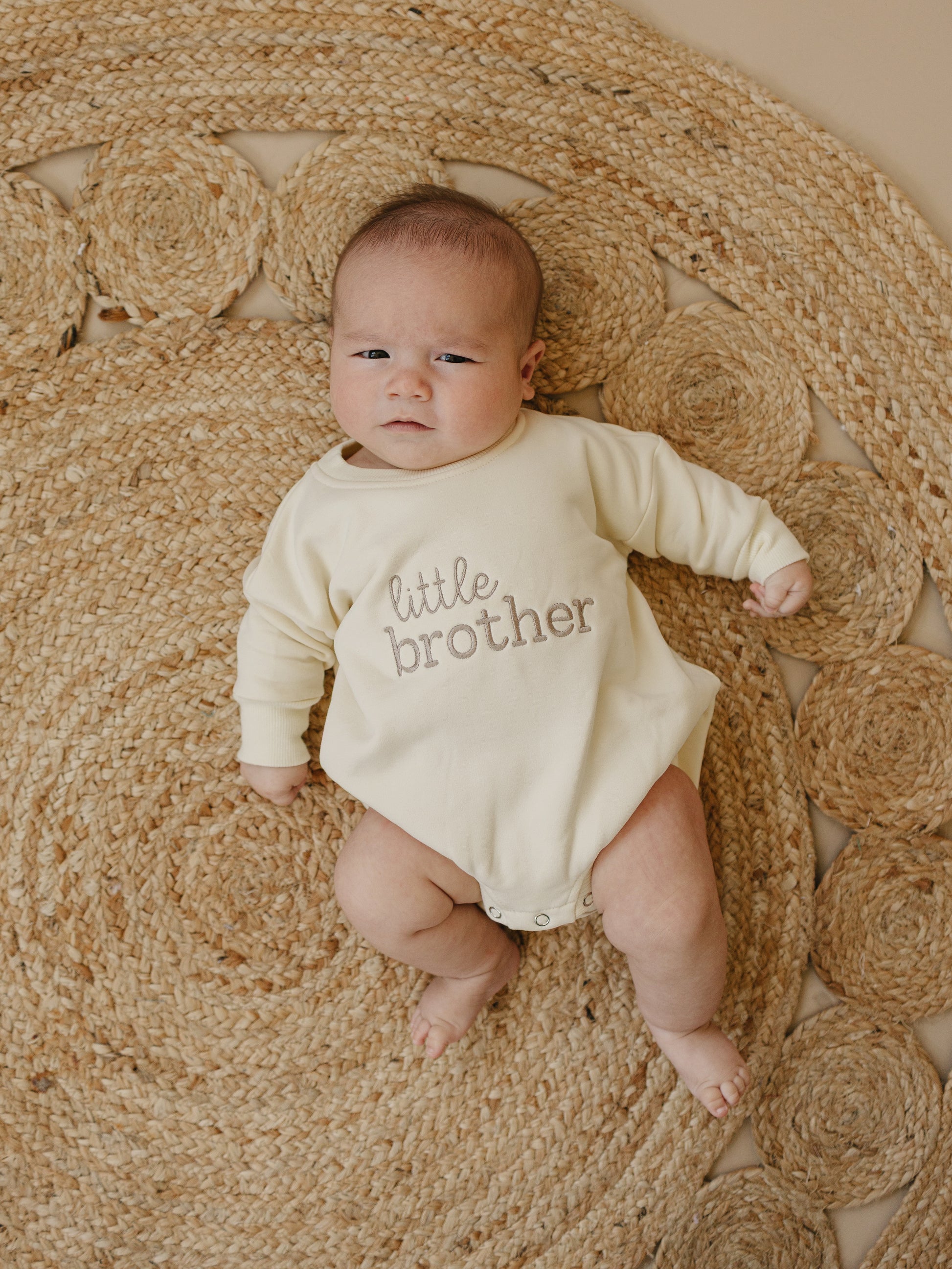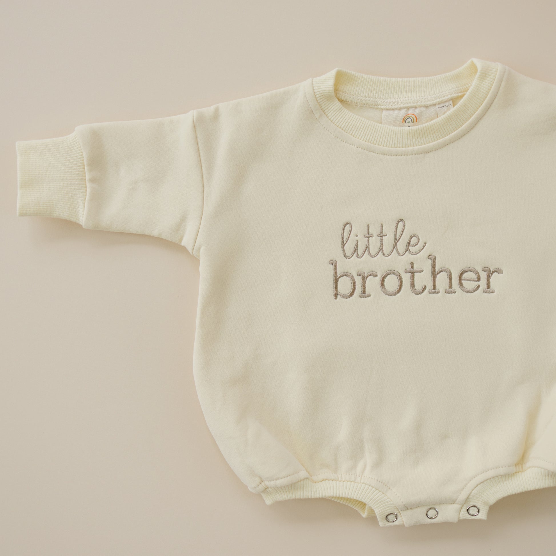 Custom embroidered sweatshirt romper. Cozy fleece terry material, 50% cotton/50% polyester.