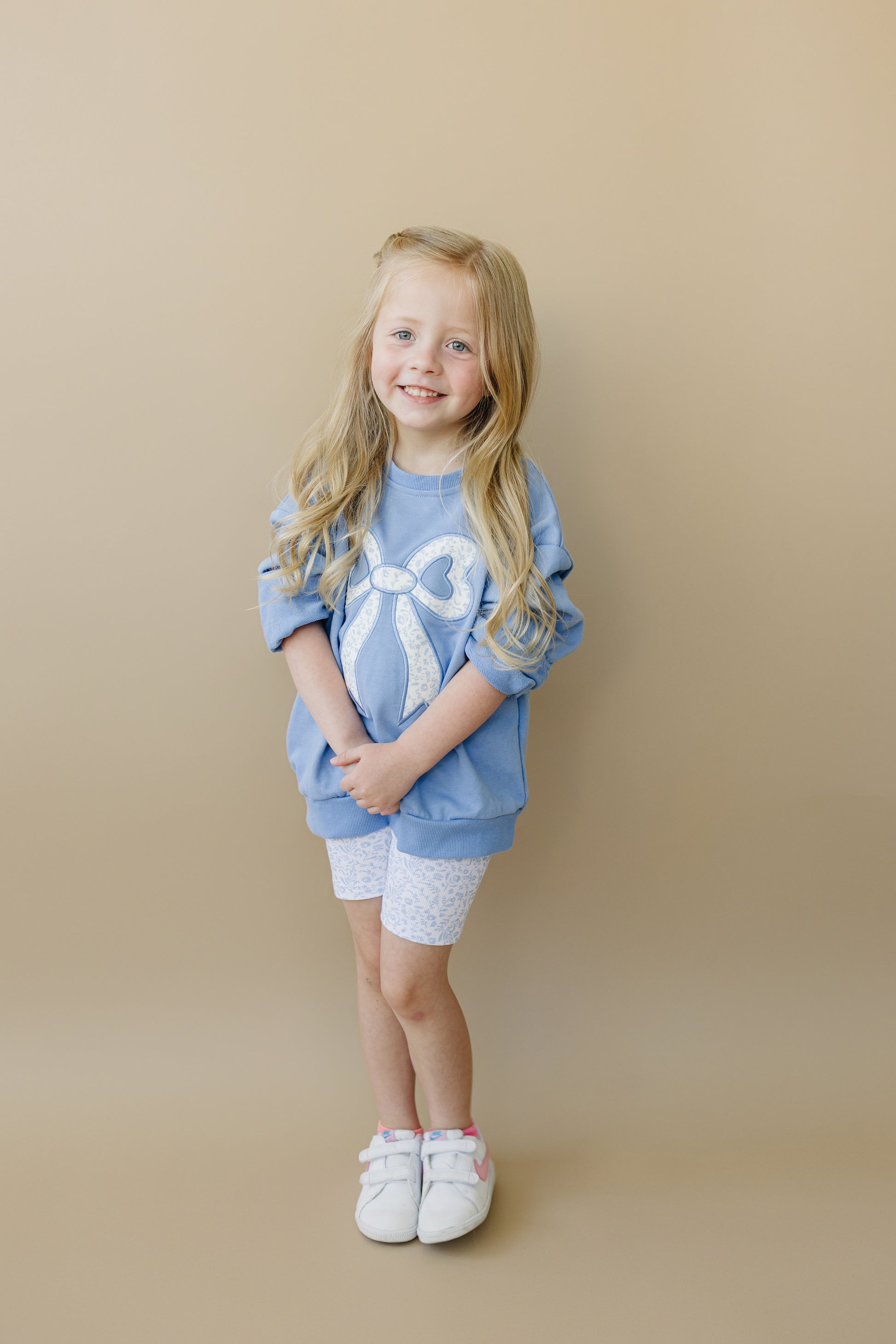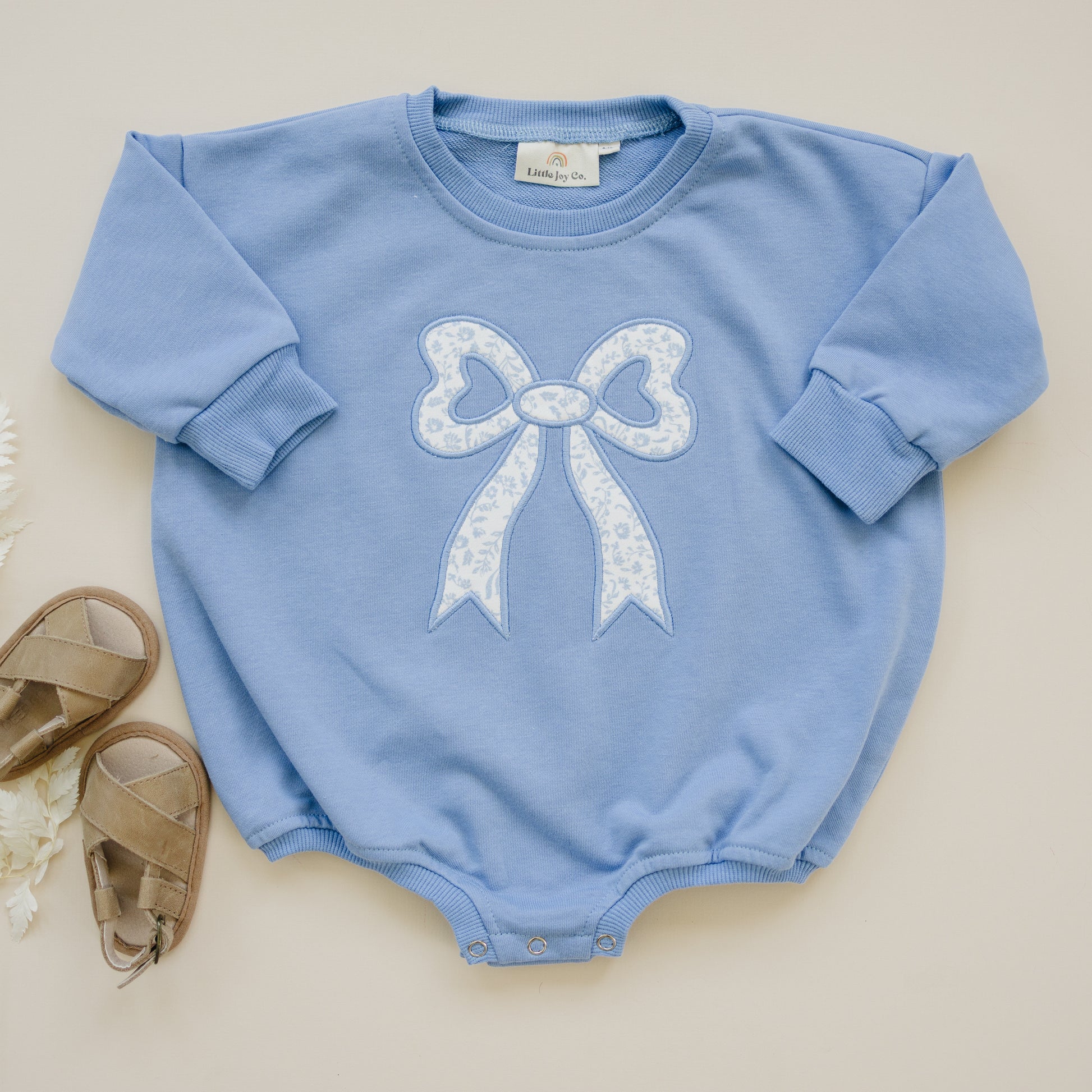Blue Toile Applique Bow Sweatshirt Romper or Crewneck
