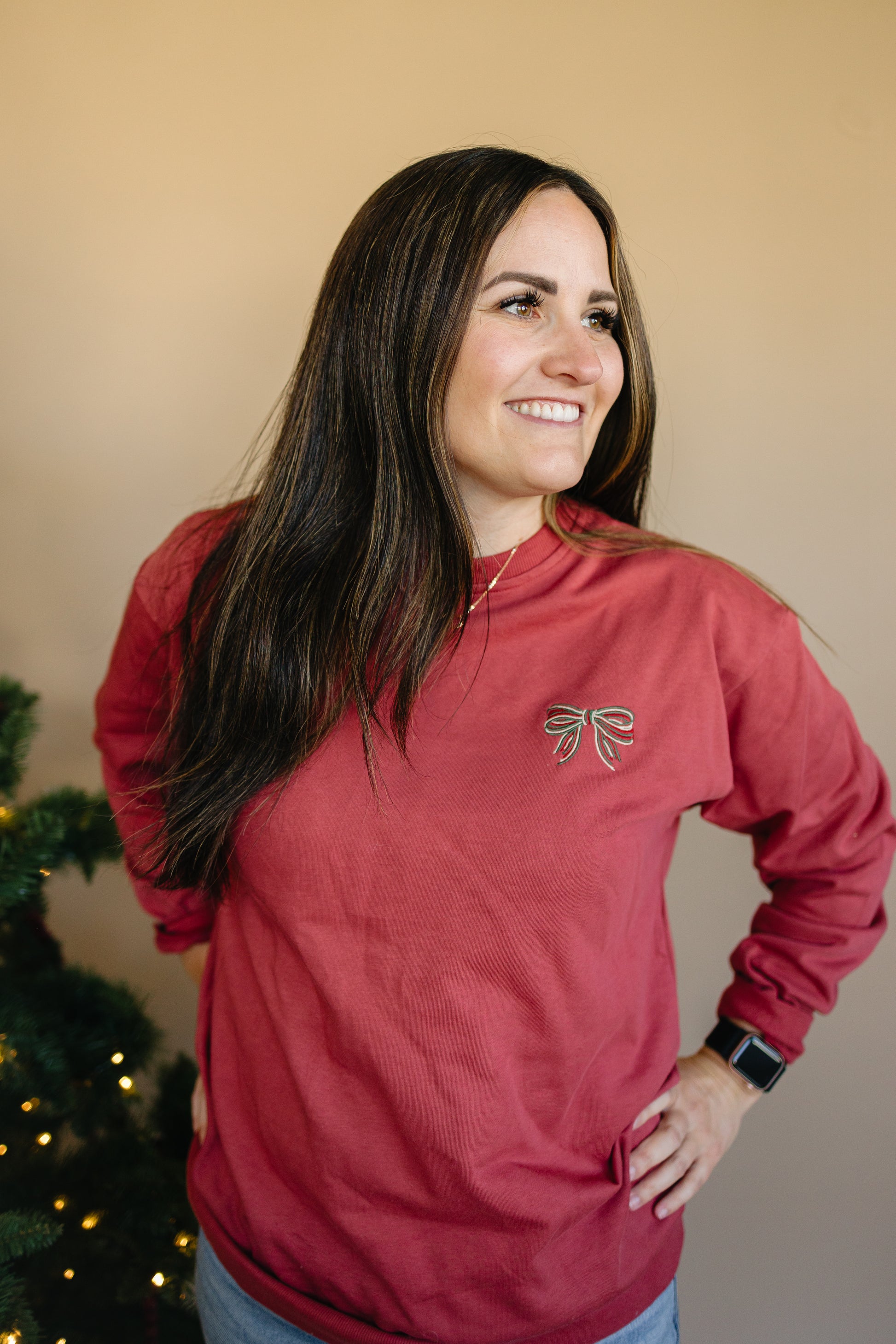 Women's Embroidered Christmas Bow Crewneck Sweatshirt
