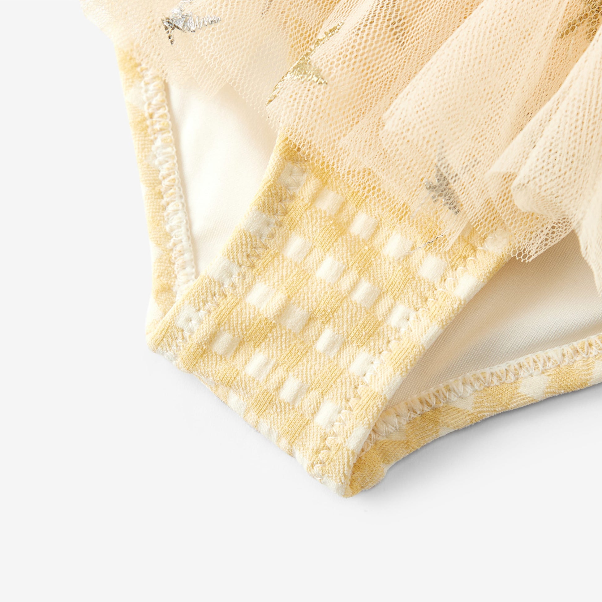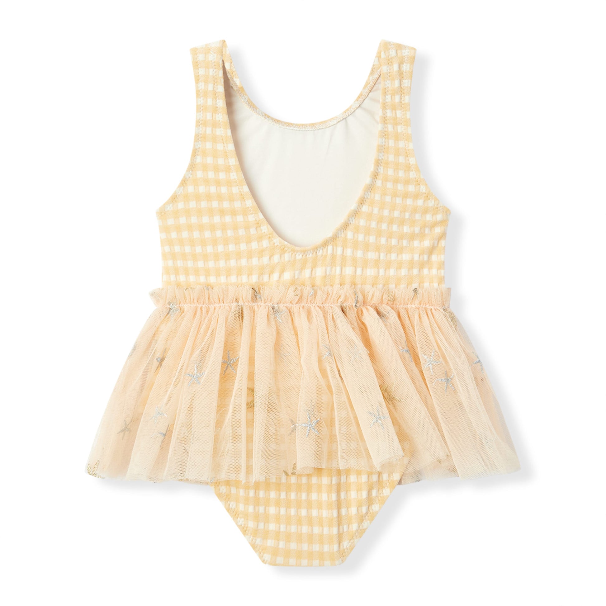 Your little ballerina will love twirling in our Ballet Skirt Swimsuit in the Yellow Gingham print. Made from a fade-resistant blend of 87% nylon, 13% spandex, and sun protection of UPF 50+, this practical and adorable swimsuit is perfect for pool parties and beach play.